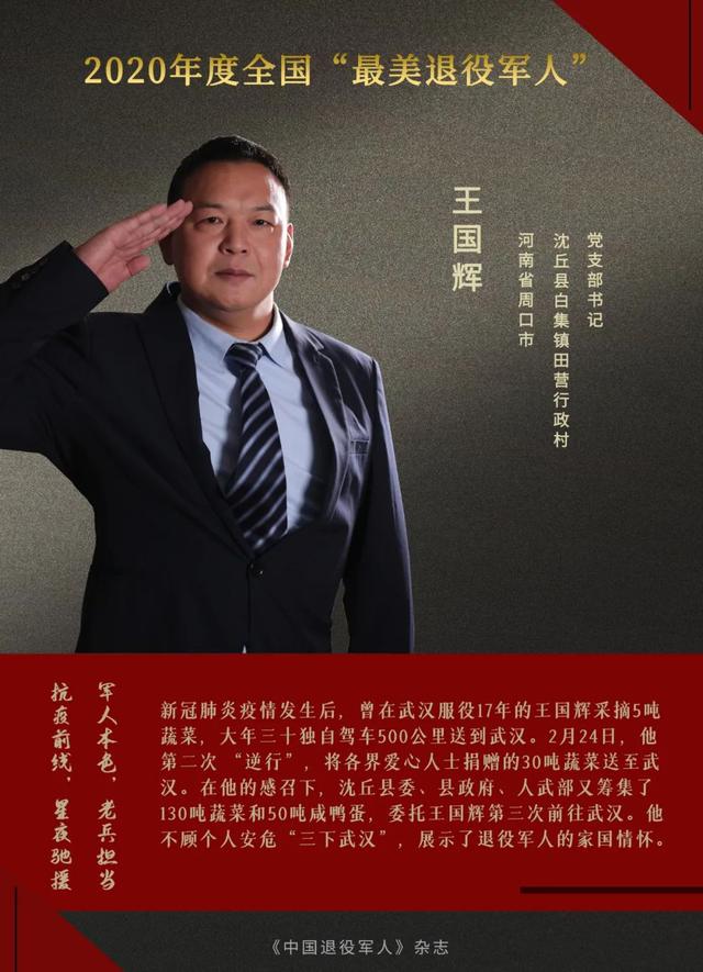 武漢新冠肺炎疫情發(fā)生后,曾在武漢服役17年的王國輝懷著對第二故鄉(xiāng)的熱愛,從自己的蔬菜種植基地采摘5噸蔬菜,大年三十獨自駕車500公里送到正在建設(shè)中的火神山醫(yī)院工地。2月24日,他第二次“逆行”將各界愛心人士捐贈的30噸蔬菜送至武漢。隨后,受沈丘縣委、縣政府、人武部委托,王國輝第三次前往武漢,送去了130噸蔬菜和50噸咸鴨蛋。他不顧個人安?!叭挛錆h”的行為,在沈丘和武漢之間架起了一座“愛心橋”,展示了退役軍人的家國情懷。曾獲“全國優(yōu)秀共產(chǎn)黨員”“全國模范退役軍人”“全國抗擊新冠肺炎疫情先進個人”等稱號。