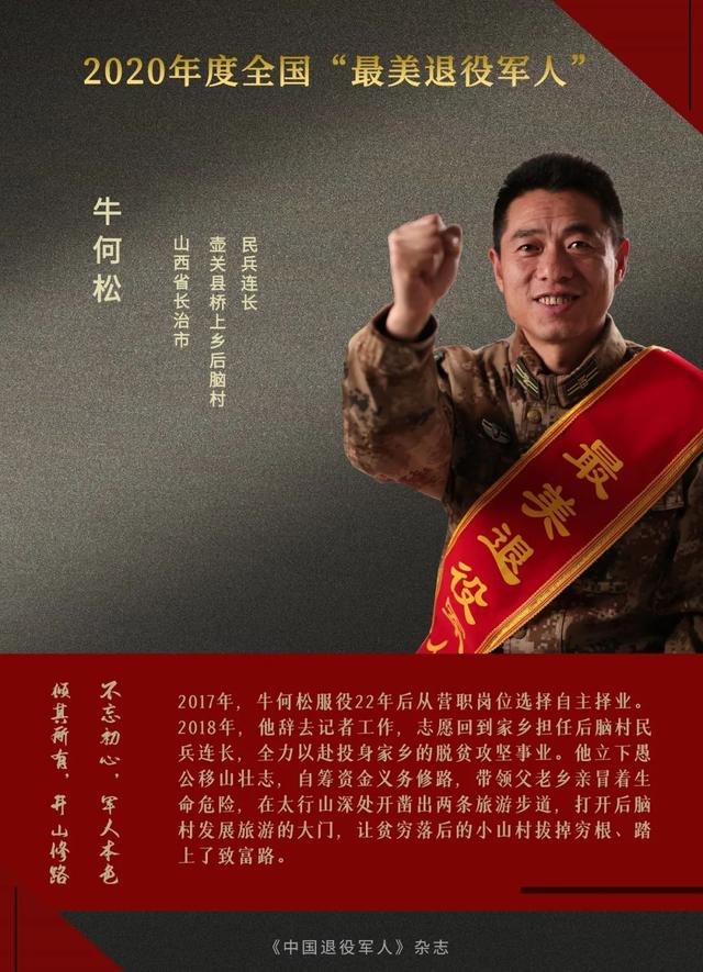 2017年,牛何松自主擇業(yè),雖然脫下軍裝,但他始終保持為黨分憂、為國奉獻(xiàn)、為民服務(wù)的本色。2018年,他辭去記者工作,回到家鄉(xiāng)擔(dān)任后腦村民兵連長,全力以赴投身家鄉(xiāng)的脫貧攻堅(jiān)事業(yè)。他立下愚公移山壯志,自籌資金義務(wù)修路,帶領(lǐng)父老鄉(xiāng)親冒著生命危險,在太行山深處開鑿出兩條旅游步道,打開后腦村發(fā)展旅游的大門,讓貧窮落后的小山村拔掉窮根,踏上了致富路。曾獲“全國道德模范提名獎”,獲“全國擁政愛民模范”“全國模范退役軍人”等稱號。