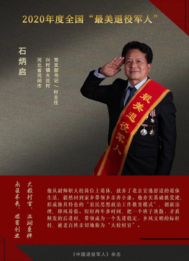 2015年,石炳啟從副師職崗位退休。2018年2月,他放棄北京安逸舒適的退休生活,毅然回到家鄉(xiāng)帶領(lǐng)鄉(xiāng)親奔小康。他夯實基礎(chǔ)抓黨建,形成獨具特色的“農(nóng)民思想政治工作教育模式”;針對村內(nèi)垃圾、道路積水、違規(guī)建筑等頑癥痼疾,建立20項村規(guī)民約整治村容村貌;以制止人情攀比、大操大辦等不良婚俗現(xiàn)象為突破口,探索村民自治管理新路,不斷推進移風易俗。短短2年多時間,把一個班子渙散、矛盾頻發(fā)的后進村,帶領(lǐng)成為一個先進穩(wěn)定、鄉(xiāng)風文明的標桿村,被老百姓親切地稱為“大校村官”。曾獲“全國模范退役軍人”稱號。