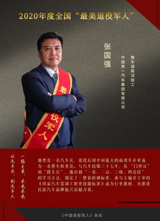 張國強曾是一名汽車兵,退役后成為一名整車檢查員。他與汽車結(jié)緣37年,從一名只會操作方向盤的“門外漢”,成長為質(zhì)保崗位上的技術(shù)“排頭兵”,是一名不折不扣的“汽車老兵”。在工作中,他自創(chuàng)“一看、二記、三練、四總結(jié)”的學習方法,制定了一整套檢測標準,參與主編并主審的《國家汽車裝調(diào)工職業(yè)技能標準》成為行業(yè)教材,為推進民族汽車品牌振興貢獻力量。曾獲“全國五一勞動獎?wù)隆保@“全國技術(shù)能手”“吉林省首席技師”等稱號。