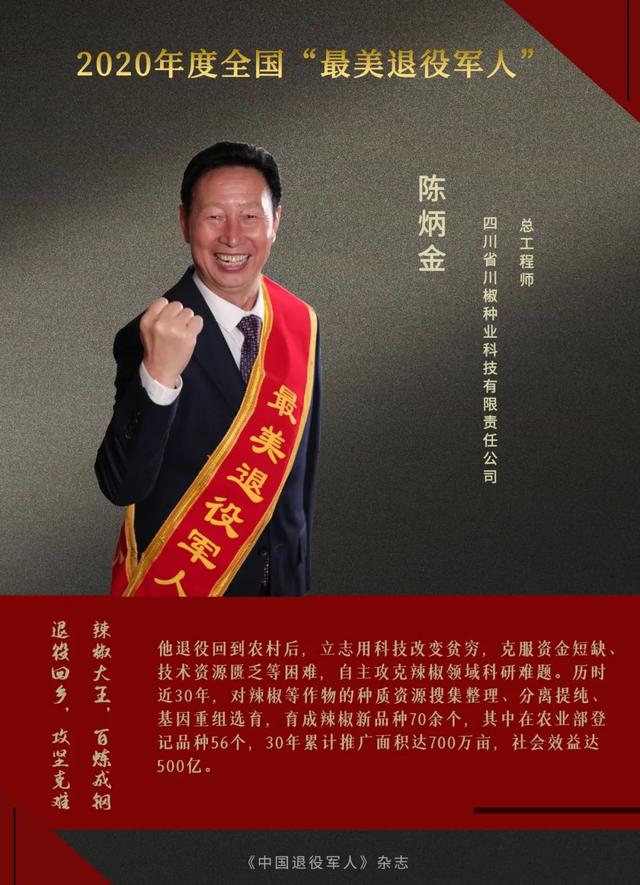 陳炳金退役回到農(nóng)村,立志用科技改變貧窮。他刻苦鉆研、虛心求教,克服資金短缺、技術(shù)資源匱乏等困難,自主攻克辣椒領(lǐng)域科研難題。經(jīng)過春在四川、冬在海南,歷時近30年對辣椒等作物種質(zhì)資源的搜集整理、分離提純、基因重組選育,育成辣椒新品種70余個,其中在農(nóng)業(yè)部登記品種56個,30年累計推廣面積達(dá)700萬畝,社會效益達(dá)500億元。他在辣椒領(lǐng)域有發(fā)明專利11項,相關(guān)育種項目獲國家科技進(jìn)步二等獎,助推我國辣椒領(lǐng)域的科技進(jìn)步。曾獲“全國勞動模范”“全國科普惠農(nóng)興村帶頭人”“全國農(nóng)村科普先進(jìn)工作者”“全國軍地兩用人才先進(jìn)個人”“全國農(nóng)村青年星火帶頭人”等稱號。
