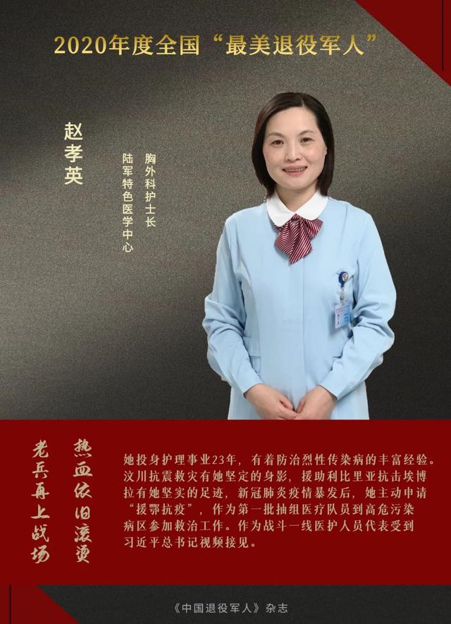 趙孝英 女,漢族,中共黨員,1979年出生,1994年入伍,2016年退役,陸軍特色醫(yī)學(xué)中心胸外科護(hù)士長