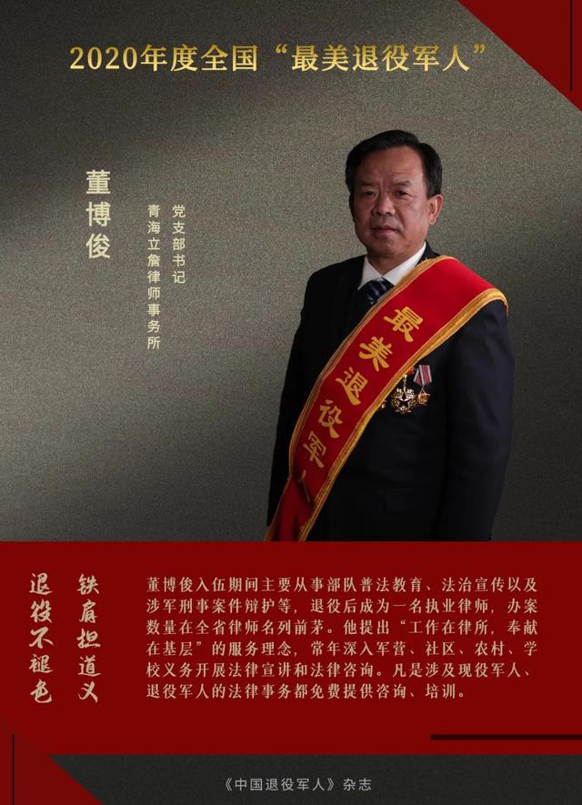 董博俊入伍期間主要從事部隊普法教育、法治宣傳以及涉軍刑事案件辯護等,退役后成為一名執(zhí)業(yè)律師,辦案數(shù)量在全省律師中名列前茅。他愛崗敬業(yè),主動擔(dān)當(dāng),提出“工作在律所,奉獻(xiàn)在基層”的服務(wù)理念,常年深入軍營、社區(qū)、農(nóng)村、學(xué)校義務(wù)開展法律宣講和法律咨詢。他始終不忘部隊教育培養(yǎng)之恩,凡是涉及現(xiàn)役軍人、退役軍人的法律事務(wù)都免費提供咨詢、培訓(xùn)。曾獲“青海省優(yōu)秀退役軍人”稱號。