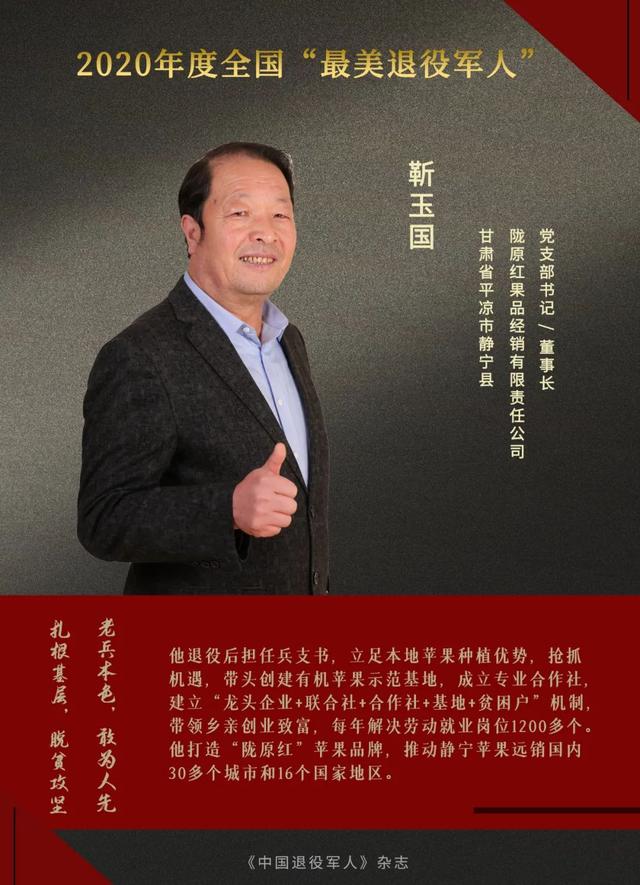 靳玉國(guó)退役后帶領(lǐng)鄉(xiāng)親創(chuàng)業(yè)致富。擔(dān)任村支書(shū)期間,他多處籌資,創(chuàng)辦木材經(jīng)銷(xiāo)站、地毯廠、磚瓦廠,讓全村300多人實(shí)現(xiàn)家門(mén)口就業(yè),所在村成為全市“10面紅旗村”之一。立足本地蘋(píng)果種植優(yōu)勢(shì),他搶抓機(jī)遇,帶頭創(chuàng)建有機(jī)蘋(píng)果示范基地,成立專(zhuān)業(yè)合作社,建立“龍頭企業(yè)+聯(lián)合社+合作社+基地+貧困戶(hù)”機(jī)制,每年解決勞動(dòng)就業(yè)崗位1200多個(gè)。他打造“隴原紅”蘋(píng)果品牌,增加產(chǎn)品附加值,增強(qiáng)市場(chǎng)競(jìng)爭(zhēng)力和知名度,推動(dòng)靜寧蘋(píng)果遠(yuǎn)銷(xiāo)國(guó)內(nèi)30多個(gè)城市和16個(gè)國(guó)家地區(qū)。曾獲“甘肅省十大杰出青年農(nóng)民”“隴原最美退役軍人”等稱(chēng)號(hào)。