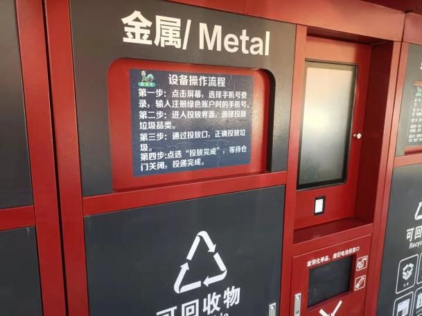 村口的垃圾桶,似乎也比其他地方要“高級(jí)”一些。紅黑相間,箱體上貼著不同的垃圾種類。最中間,有一塊電子顯示屏,旁邊清楚羅列著操作流程:輸入注冊(cè)綠色賬號(hào)時(shí)的手機(jī)號(hào),選擇投放垃圾品類,投放后點(diǎn)選“投放完成”。