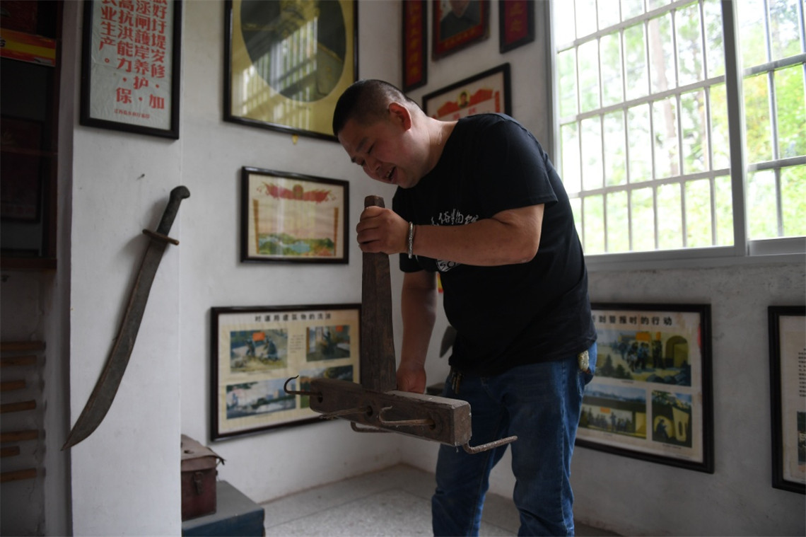 6月12日,羅小龍在展示村民當年為紅軍打草鞋使用的擰繩工具。新華社記者 周密 攝