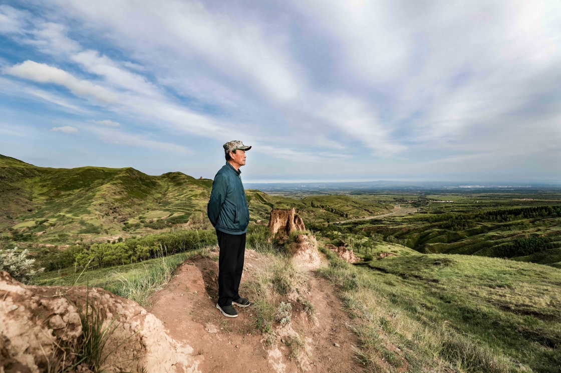 張連印在山西大同左云縣摩天嶺土長(zhǎng)城眺望苗圃、山林(6月13日攝)。新華社發(fā)(丁美寧 攝)