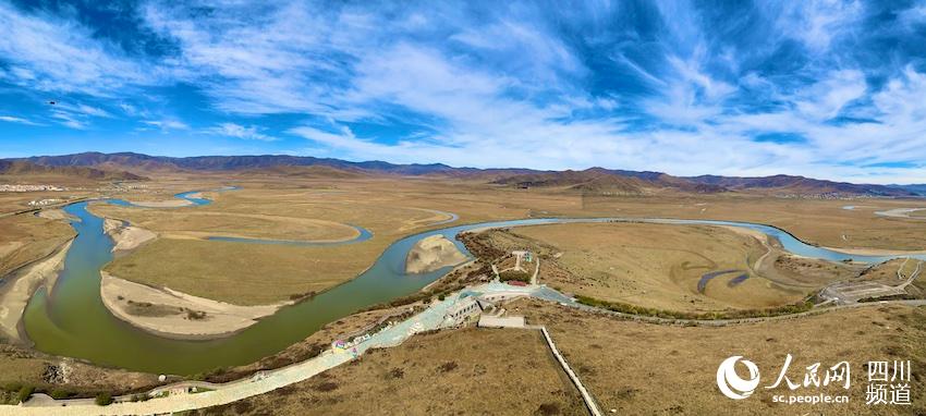 晶瑩剔透的白河,在深秋的紅原劃過一道優(yōu)美的弧線,仿佛一彎落在人間的新月,天藍(lán)云白、水碧地燦。這里,是國(guó)家4A級(jí)旅游景區(qū)、被《中國(guó)國(guó)家地理》評(píng)為“100個(gè)最美觀景拍攝點(diǎn)”之一的月亮灣。