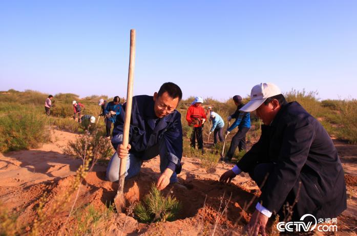 2019年,張應(yīng)龍(左)在沙地同當(dāng)?shù)剞r(nóng)民一起種樹。