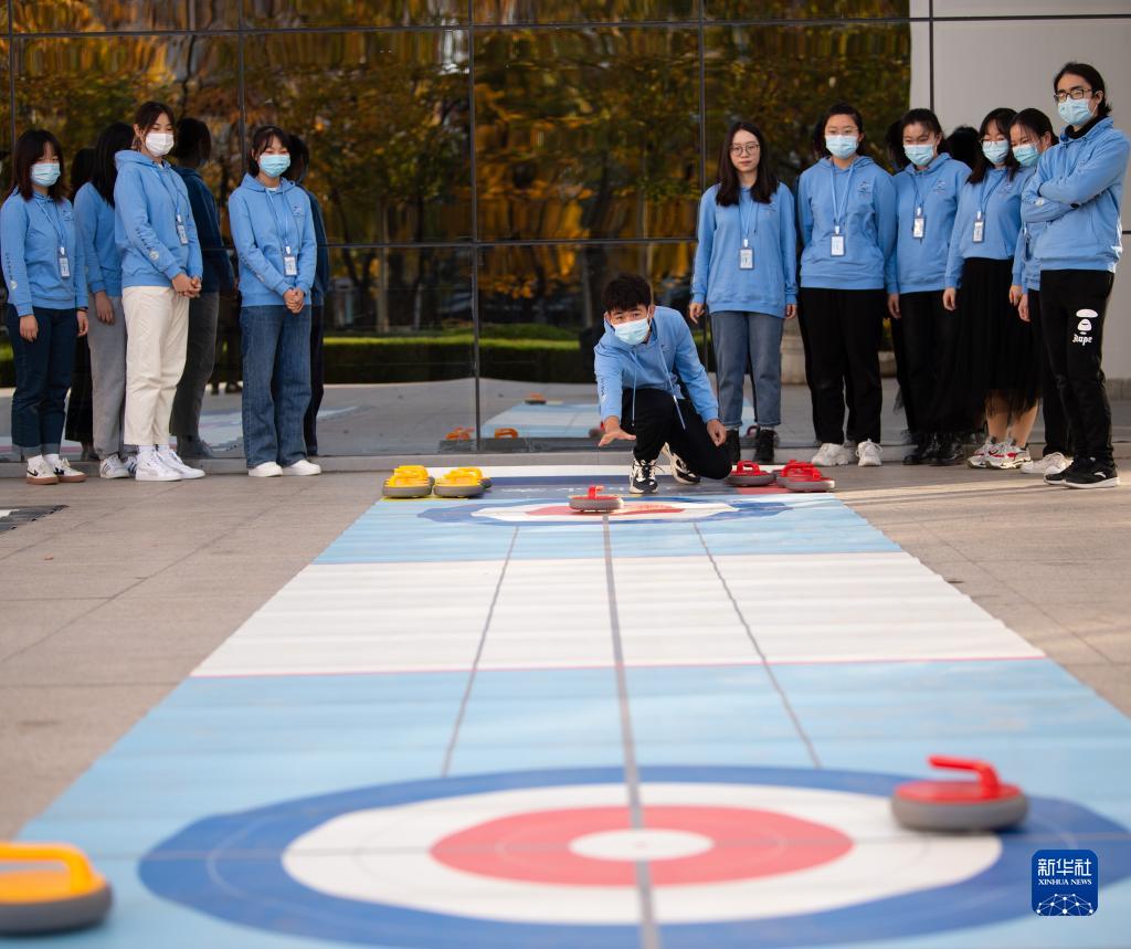 10月31日,北京語(yǔ)言大學(xué)的志愿者們?cè)隗w驗(yàn)旱地冰壺。