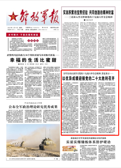 連日來,全軍官兵以多種形式認(rèn)真學(xué)習(xí)黨的十九屆六中全會(huì)精神。大家堅(jiān)定表示,要堅(jiān)持以習(xí)近平新時(shí)代中國(guó)特色社會(huì)主義思想為指導(dǎo),深入貫徹習(xí)近平強(qiáng)軍思想,聚力練兵備戰(zhàn),銳意開拓進(jìn)取,為實(shí)現(xiàn)黨在新時(shí)代的強(qiáng)軍目標(biāo)、把人民軍隊(duì)全面建成世界一流軍隊(duì)不懈奮斗,以優(yōu)異成績(jī)迎接黨的二十大勝利召開。