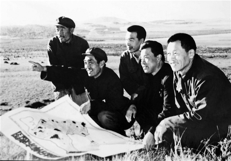 塞罕壩機(jī)械林場建設(shè)初期,王尚海(右二)、劉文仕(左二)等林場領(lǐng)導(dǎo)在茫茫荒原規(guī)劃美好藍(lán)圖。