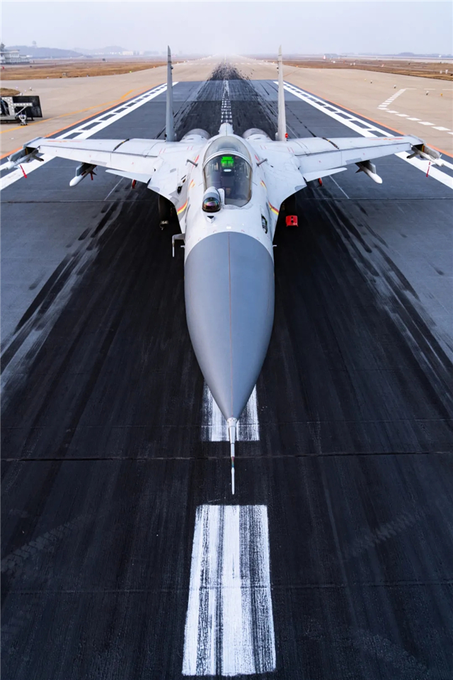 海軍航空大學(xué)某基地組織晝間飛行訓(xùn)練,這是一架殲-15戰(zhàn)機(jī)在起飛線處蓄勢(shì)待發(fā)(萬全 攝)