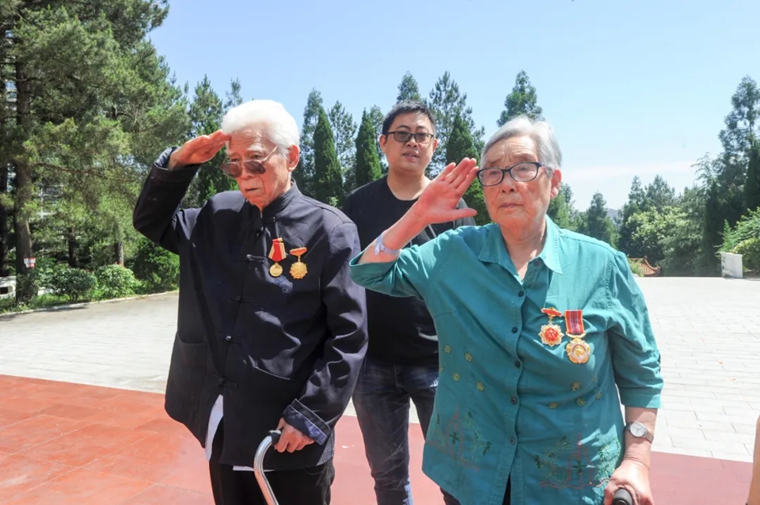 八路軍老戰(zhàn)士張朝榮與老伴梁樹南拄著拐杖,帶著兒子、孫子、孫媳和兩個重孫女,一家7口來到這里,向長眠于此的革命烈士莊嚴(yán)敬禮、獻(xiàn)上鮮花。