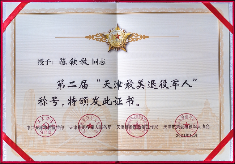 退役后,憑著“干就要干出個(gè)樣子來(lái)”的創(chuàng)業(yè)精神,陳欽放成立了天津飛豪文化傳媒有限公司,專門從事軍隊(duì)和政府部門的宣傳片拍攝與制作工作。他和團(tuán)隊(duì)創(chuàng)作的影像作品多次獲獎(jiǎng)。其中,微電影《洋河老張》榮獲第二屆亞洲48小時(shí)極拍比賽最佳元素設(shè)計(jì)獎(jiǎng);微電影《回聲》榮獲第三屆亞洲48小時(shí)極拍比賽最佳剪輯獎(jiǎng),榮獲第五屆中國(guó)國(guó)際微電影展“十佳城市微電影”。2021年7月,陳欽放被評(píng)為和平區(qū)第三屆“最美退役軍人”;2021年12月,評(píng)為第二屆“天津最美退役軍人”。