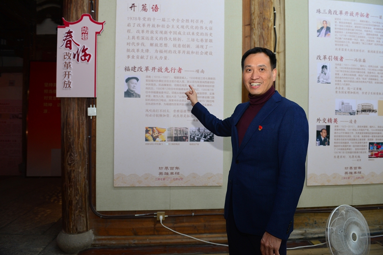 聞進(jìn)在“坊巷百年 英雄豐碑——三坊七巷紅色記憶”展板前介紹