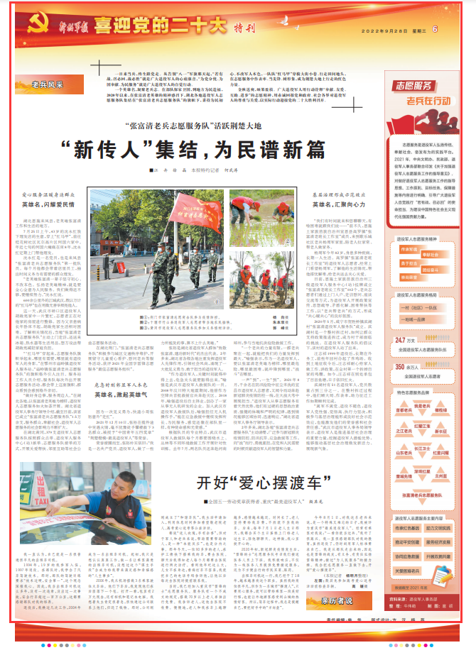 一個(gè)英雄名,凝聚老兵志。在部隊(duì)保家衛(wèi)國(guó),到地方為民造福,2020年以來(lái),在張富清老英雄的精神感召下,湖北各地退役軍人志愿服務(wù)隊(duì)集結(jié)在“張富清老兵志愿服務(wù)隊(duì)”的旗幟下,秉持為民初心、不改軍人本色,一隊(duì)隊(duì)“紅馬甲”穿梭大街小巷、行走田間地頭,在志愿服務(wù)中作表率、當(dāng)先鋒、樹(shù)形象,成為荊楚大地上行走的紅色力量。