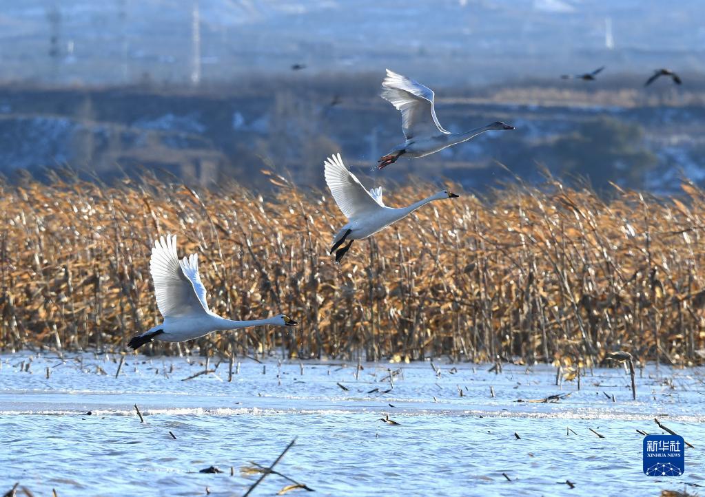 2021年11月13日,三只天鵝在懷來官廳水庫濕地公園飛舞。新華社記者楊世堯攝