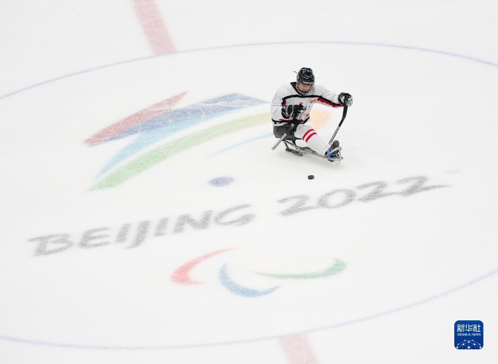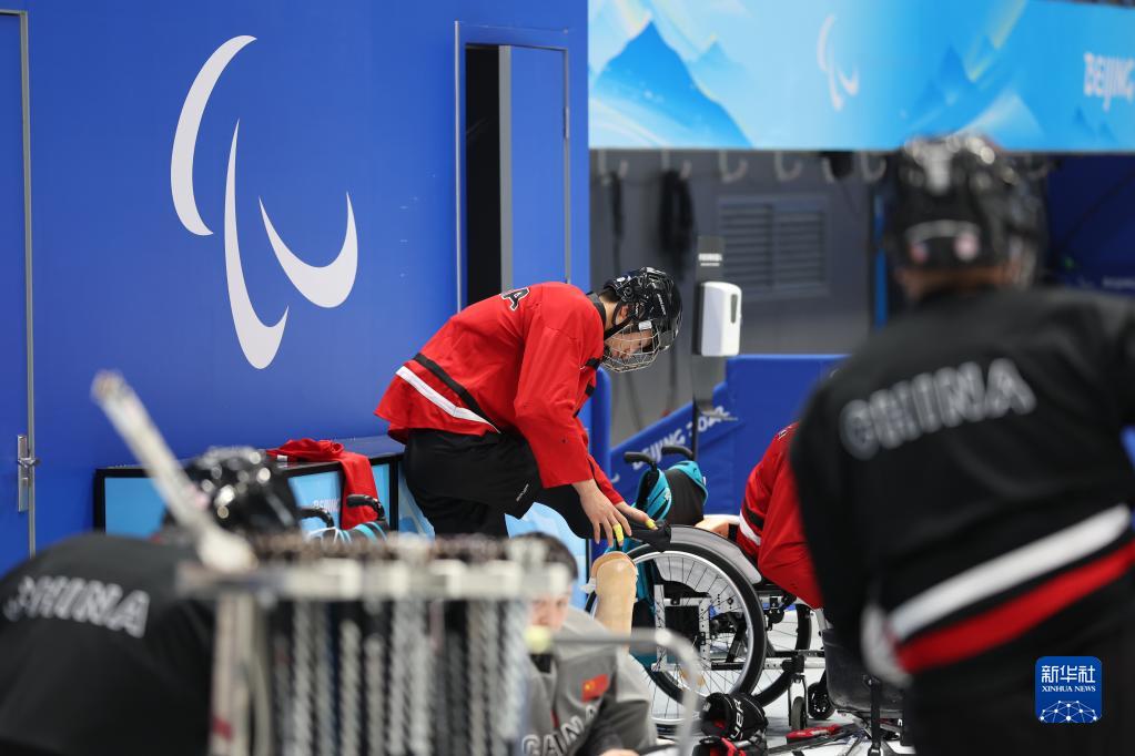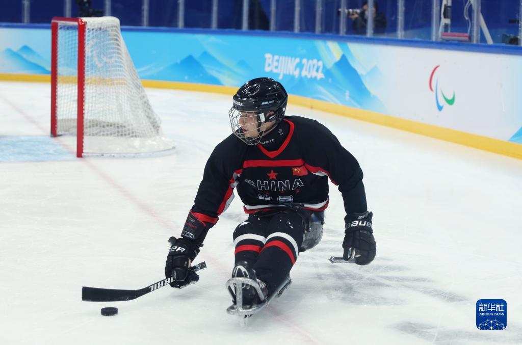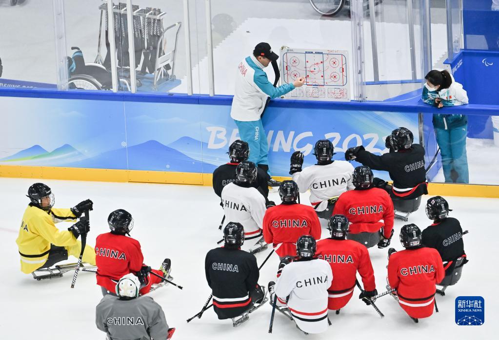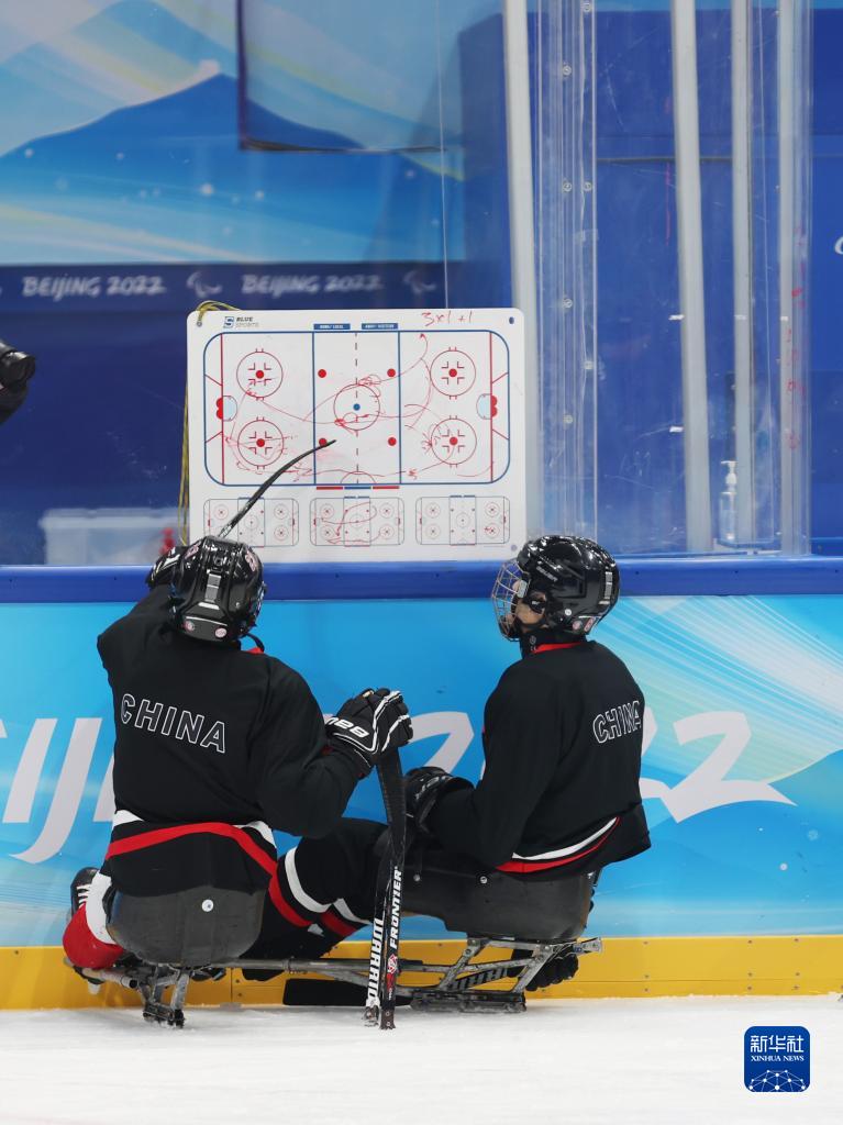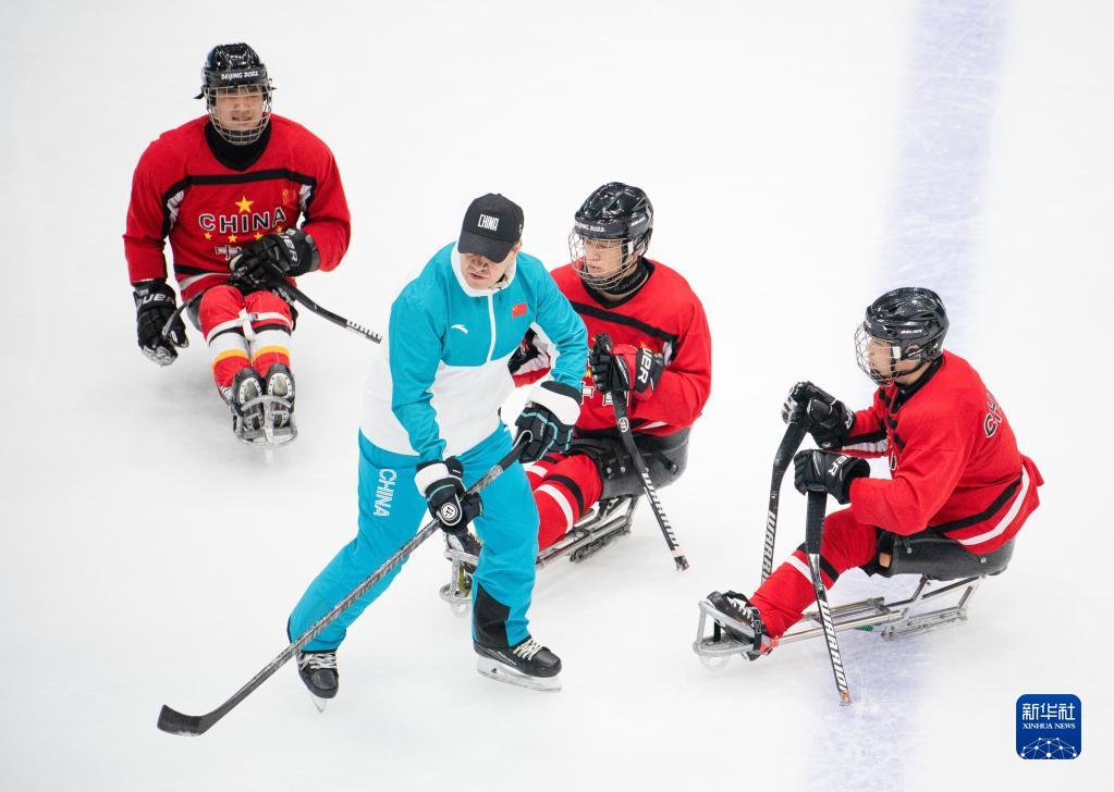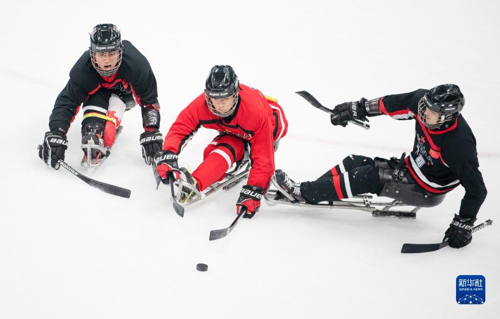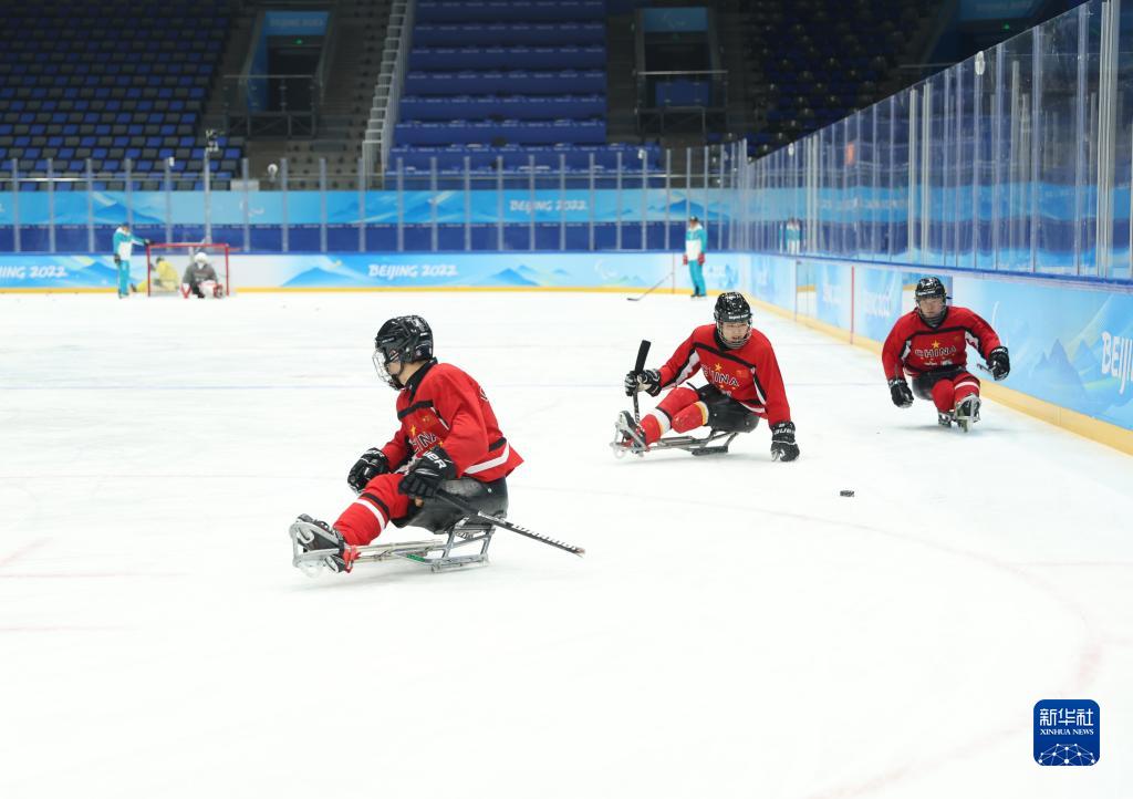 當(dāng)日,中國殘奧冰球隊(duì)在北京國家體育館進(jìn)行賽前訓(xùn)練,備戰(zhàn)北京2022年冬殘奧會(huì)比賽。