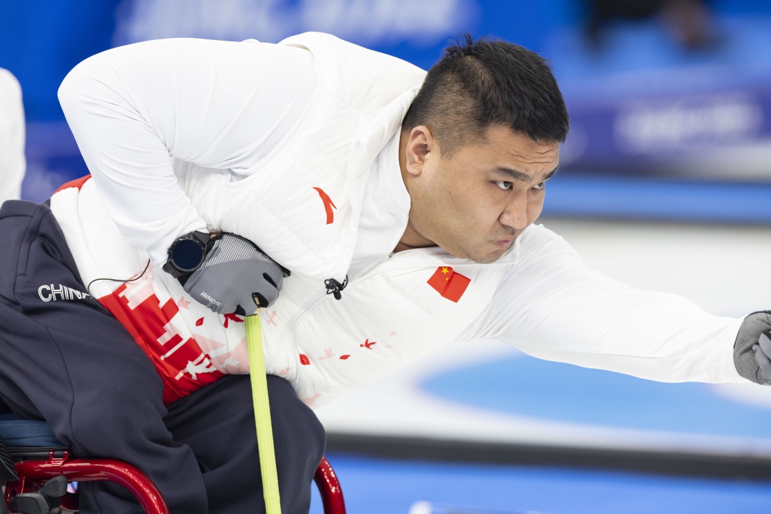 3月10日,中國隊選手王海濤(左三)在比賽中擲壺。新華社記者 才揚 攝