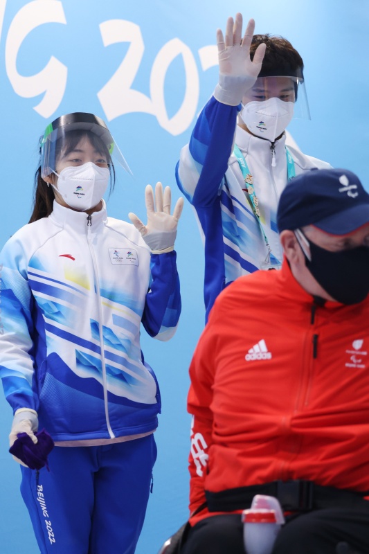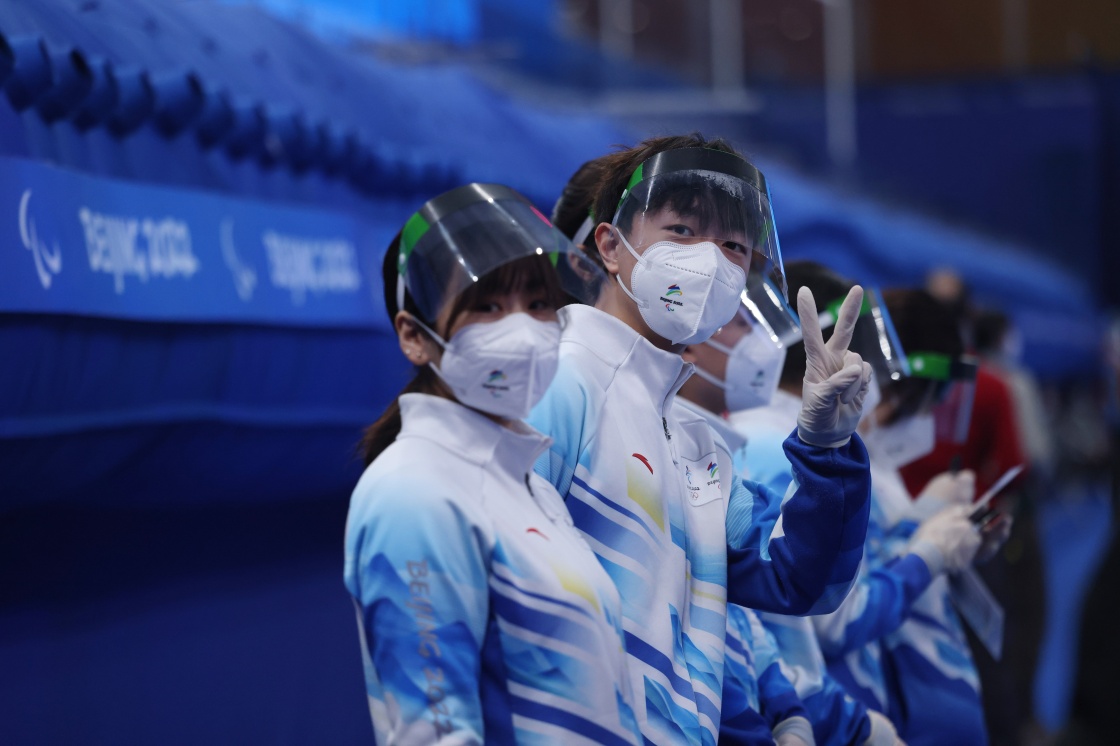 3月6日,志愿者在輪椅冰壺循環(huán)賽前向進(jìn)場(chǎng)運(yùn)動(dòng)員揮手致意。