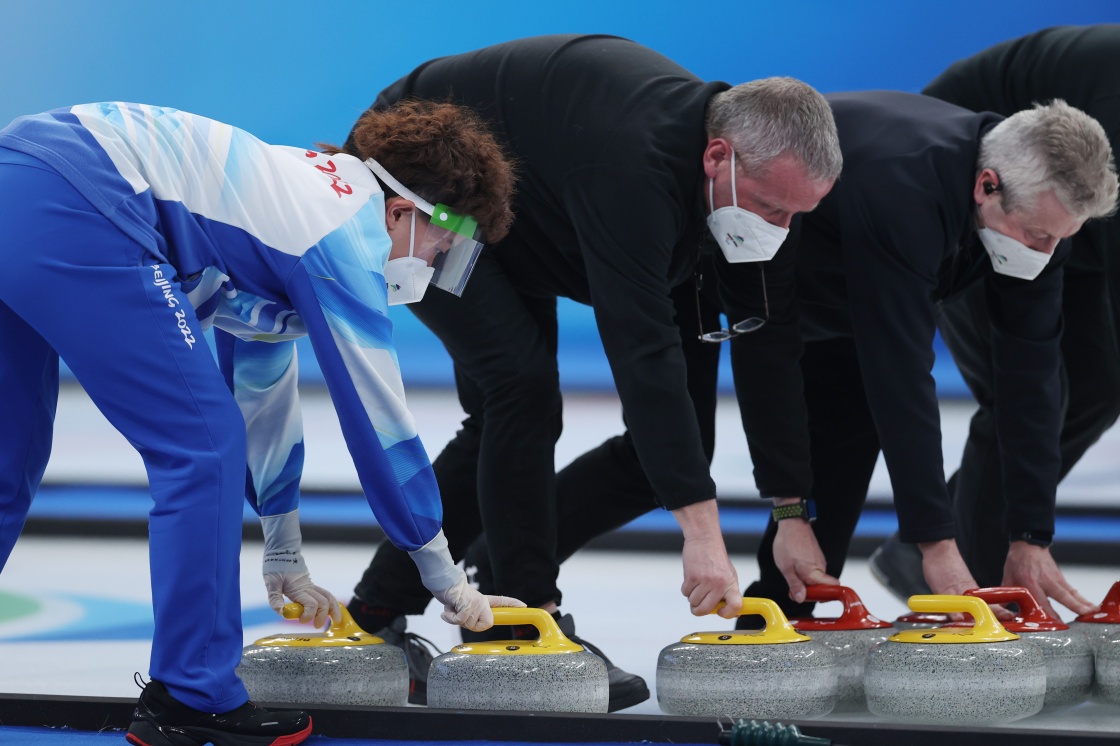 3月6日,志愿者為運(yùn)動(dòng)員擺放冰壺。新華社記者 許雅楠 攝