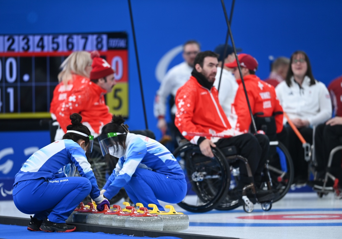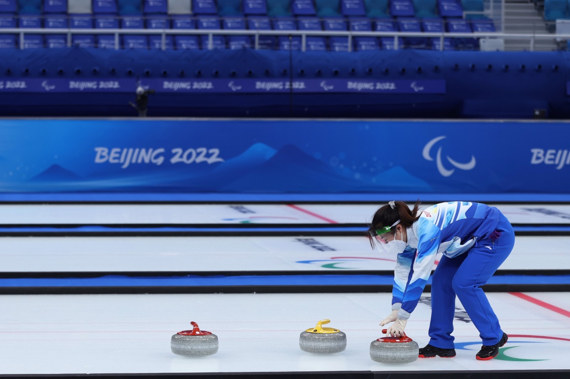 3月6日,志愿者在輪椅冰壺循環(huán)賽中為運(yùn)動(dòng)員擺冰壺。新華社記者 杜瀟逸 攝