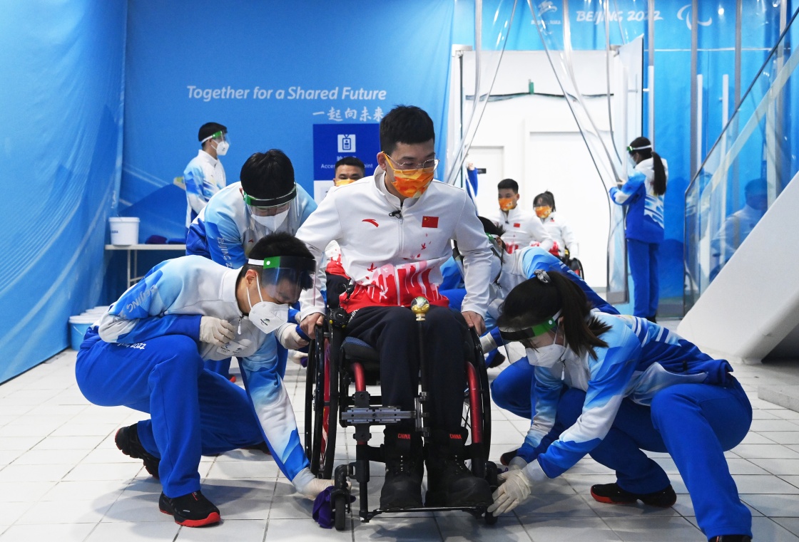 3月6日,志愿者賽前為中國(guó)隊(duì)選手陳建新清潔輪椅。新華社記者 任超 攝