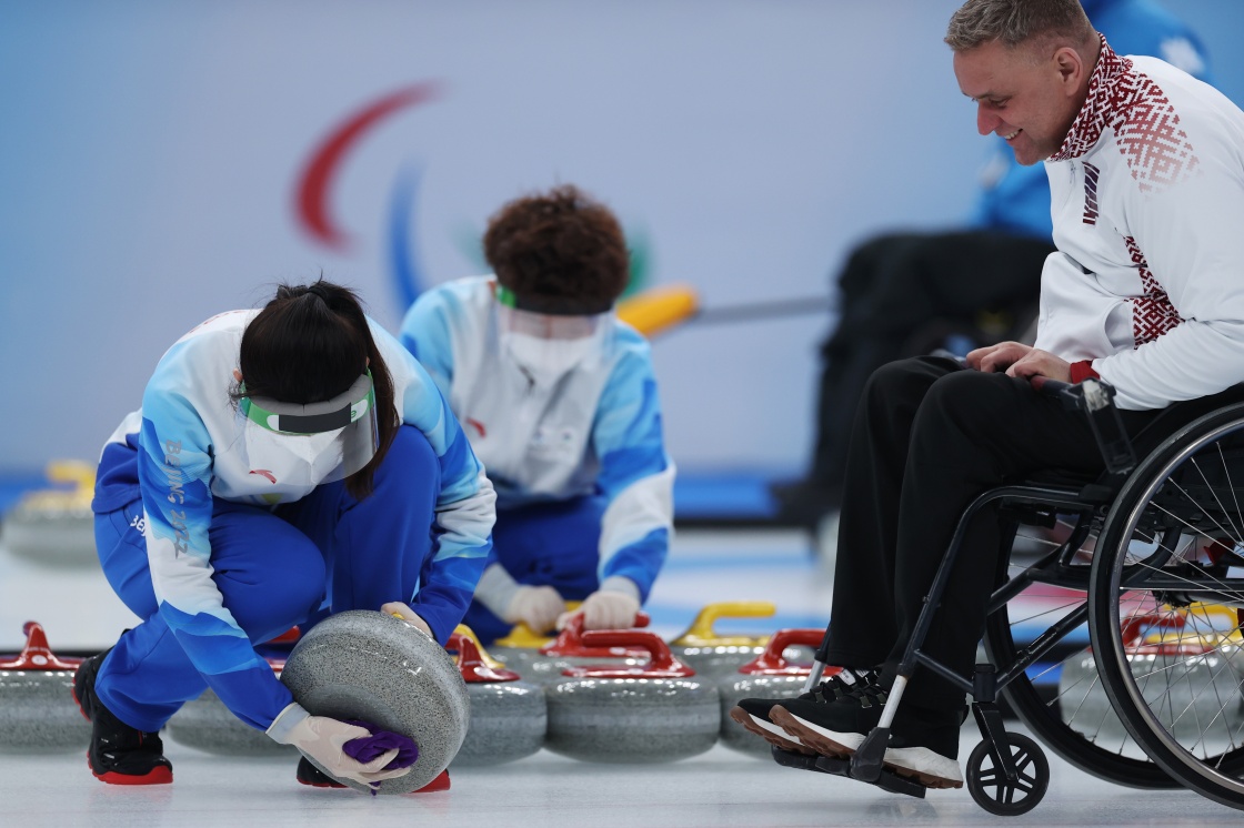 3月6日,志愿者在輪椅冰壺循環(huán)賽中與運(yùn)動(dòng)員溝通。新華社記者 許雅楠 攝