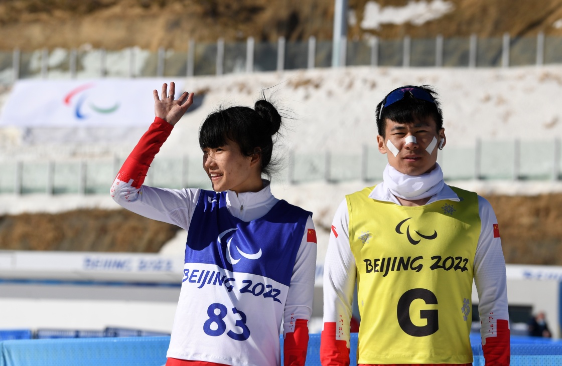 3月8日,在殘奧冬季兩項(xiàng)女子中距離(視障)比賽后,王躍(左)向現(xiàn)場(chǎng)觀眾致意。