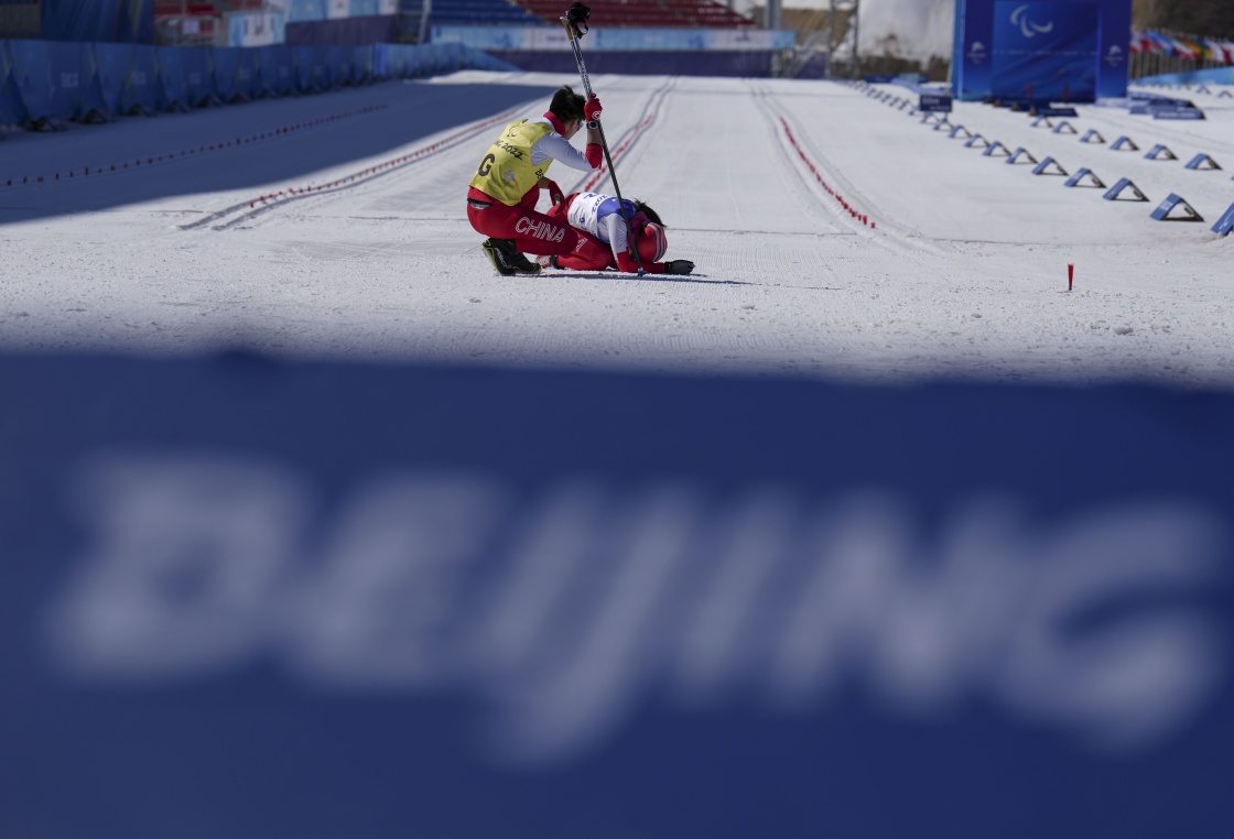 王躍(右)在殘奧越野滑雪女子長(zhǎng)距離傳統(tǒng)技術(shù)(視障)比賽后累倒在地,引導(dǎo)員李亞林在一旁陪伴(3月7日攝)。新華社記者 胡虎虎 攝