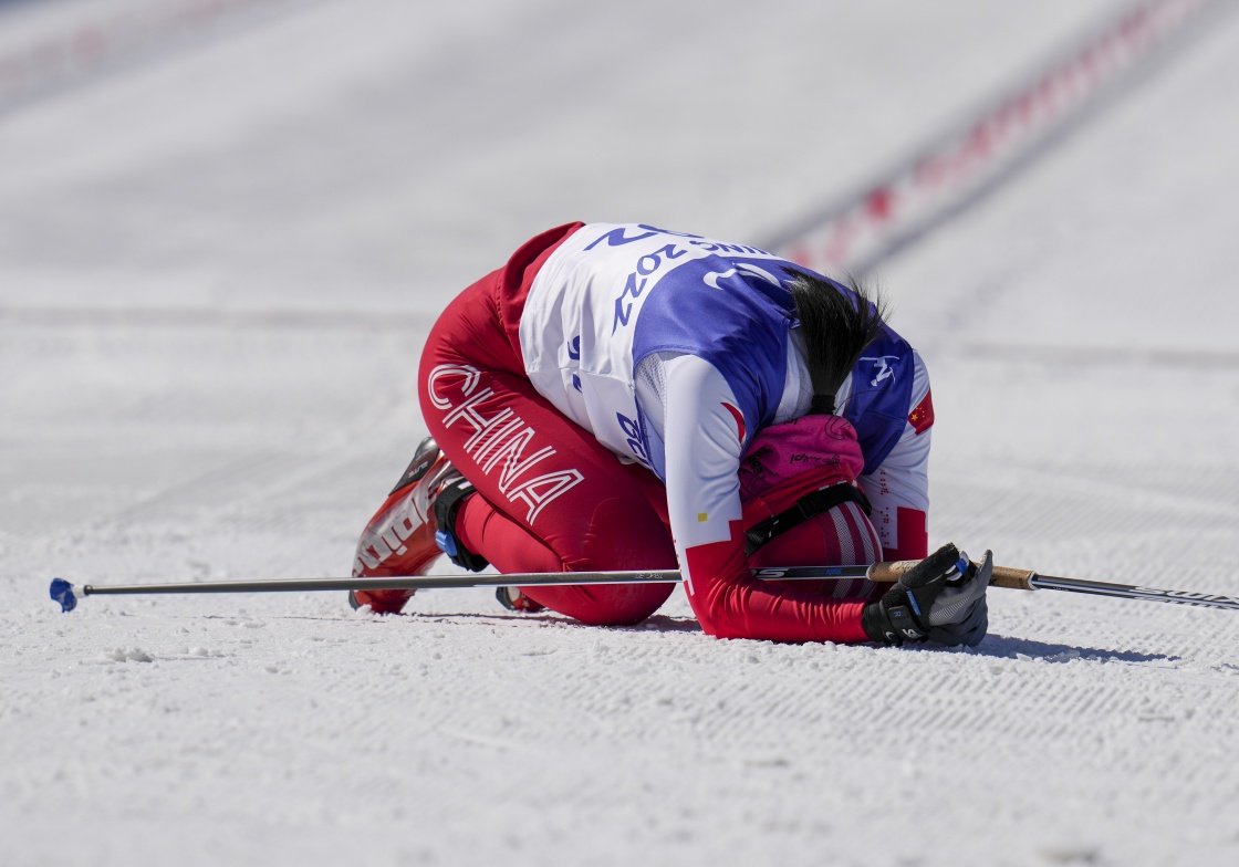 王躍在殘奧越野滑雪女子長(zhǎng)距離傳統(tǒng)技術(shù)(視障)比賽后(3月7日攝)。新華社記者 胡虎虎 攝