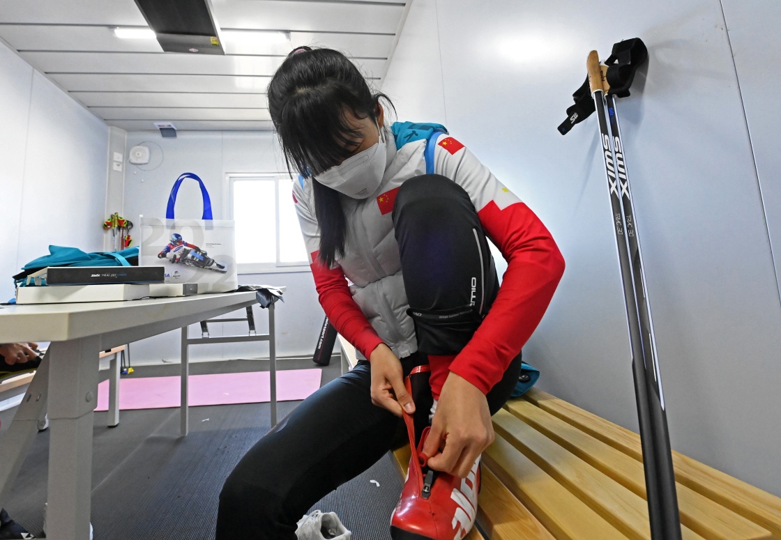 殘奧越野滑雪女子長(zhǎng)距離傳統(tǒng)技術(shù)(視障)比賽前,王躍在國家冬季兩項(xiàng)中心的打蠟房?jī)?nèi)整理裝備(3月7日攝)。新華社記者 趙子碩 攝