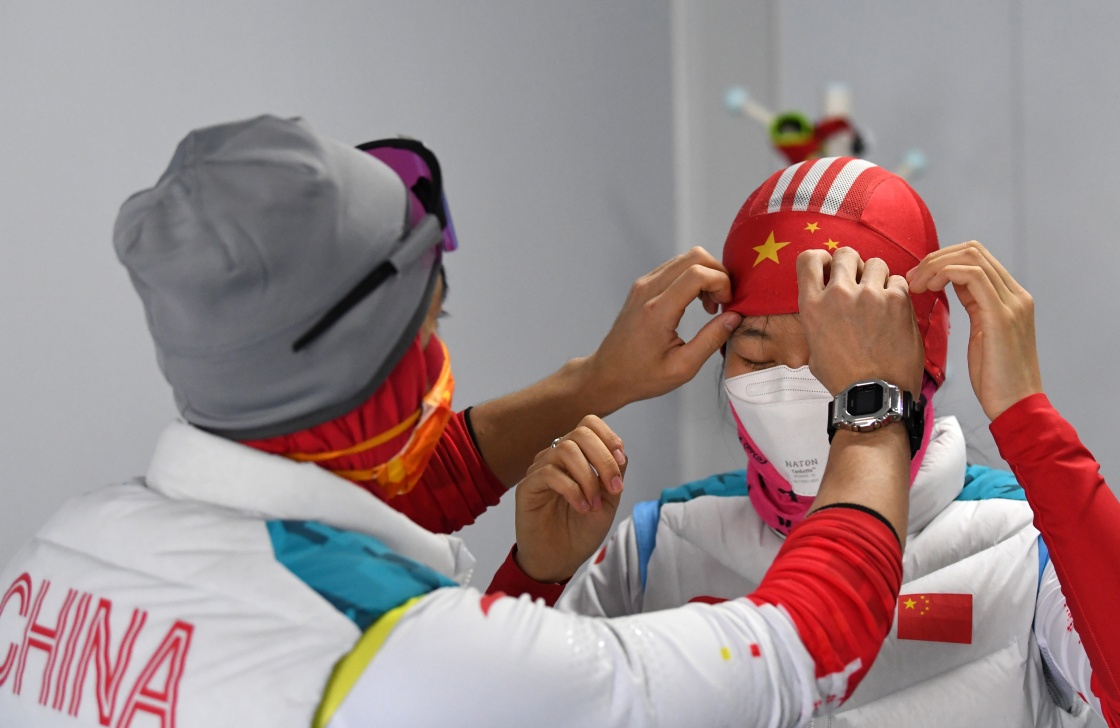 王躍的引導(dǎo)員李亞林幫助她在殘奧越野滑雪女子長(zhǎng)距離傳統(tǒng)技術(shù)(視障)比賽前整理裝備(3月7日攝)。新華社記者 趙子碩 攝