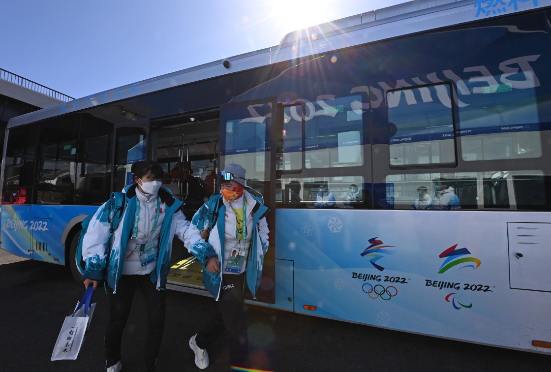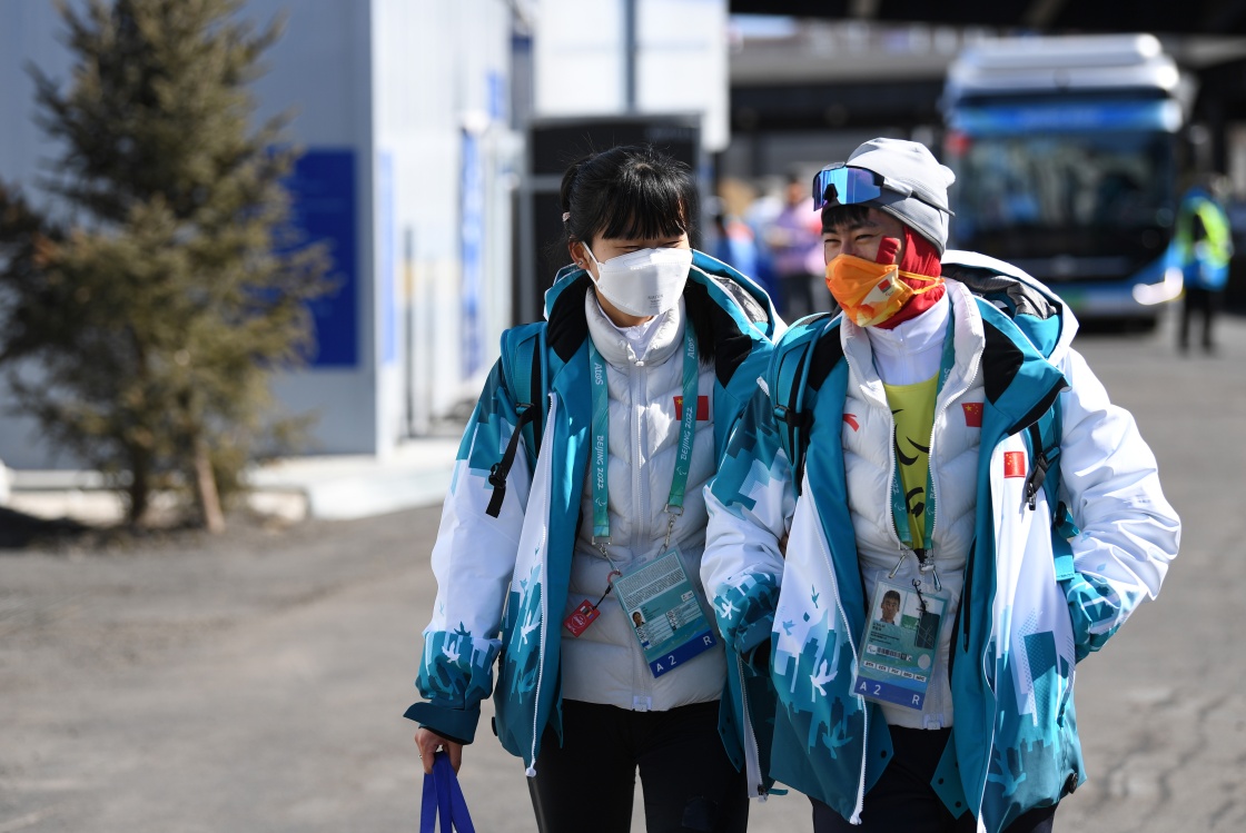 王躍(左)和她的引導(dǎo)員李亞林乘車抵達(dá)國家冬季兩項(xiàng)中心(3月7日攝)。新華社記者 趙子碩 攝