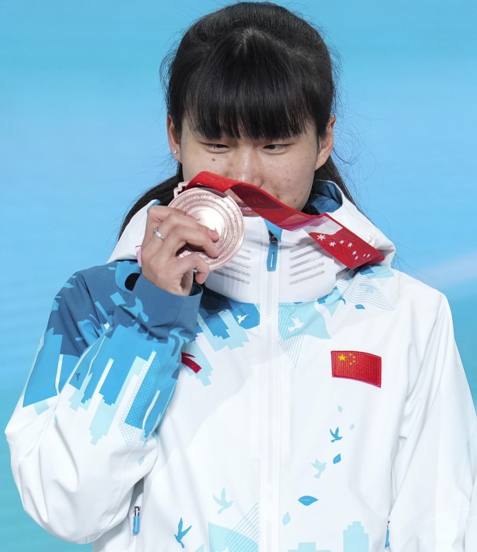 3月8日,在殘奧冬季兩項(xiàng)女子中距離(視障)比賽頒獎(jiǎng)儀式上,王躍拿著獎(jiǎng)牌仔細(xì)端詳。新華社記者 胡虎虎 攝