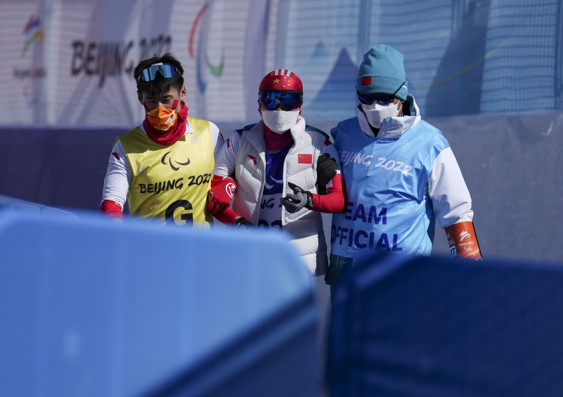 殘奧越野滑雪女子長(zhǎng)距離傳統(tǒng)技術(shù)(視障)比賽后,王躍(中)在引導(dǎo)員李亞林和工作人員的幫助下離開比賽場(chǎng)地(3月7日攝)。新華社記者 胡虎虎 攝