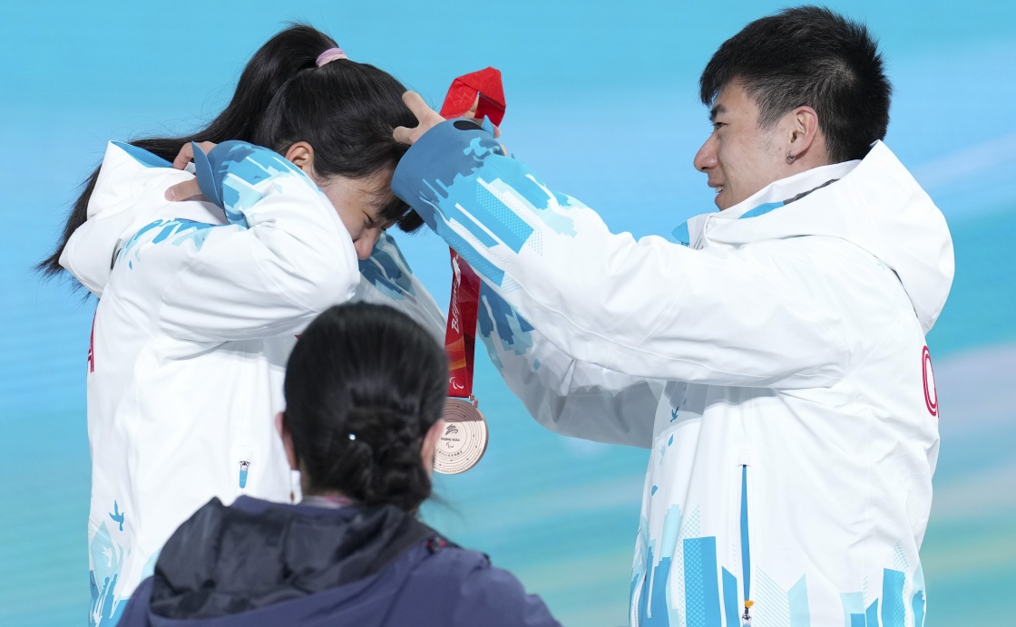 3月8日,在殘奧冬季兩項(xiàng)女子中距離(視障)比賽頒獎(jiǎng)儀式上,引導(dǎo)員李亞林(右)為王躍佩戴獎(jiǎng)牌。新華社記者 胡虎虎 攝