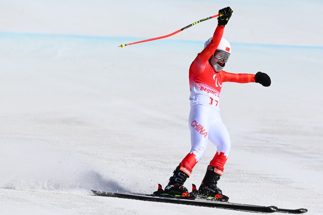 3月7日,張夢秋在北京2022年冬殘奧會殘奧高山滑雪女子全能(站姿)比賽中,她獲得該項目亞軍。新華社記者 江漢 攝