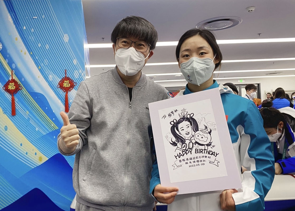 這是北京延慶冬殘奧村服務(wù)保障團隊成員為張夢秋(右)提前送上生日禮物和祝福(3月8日攝)。新華社發(fā)(中國殘奧高山滑雪隊供圖)