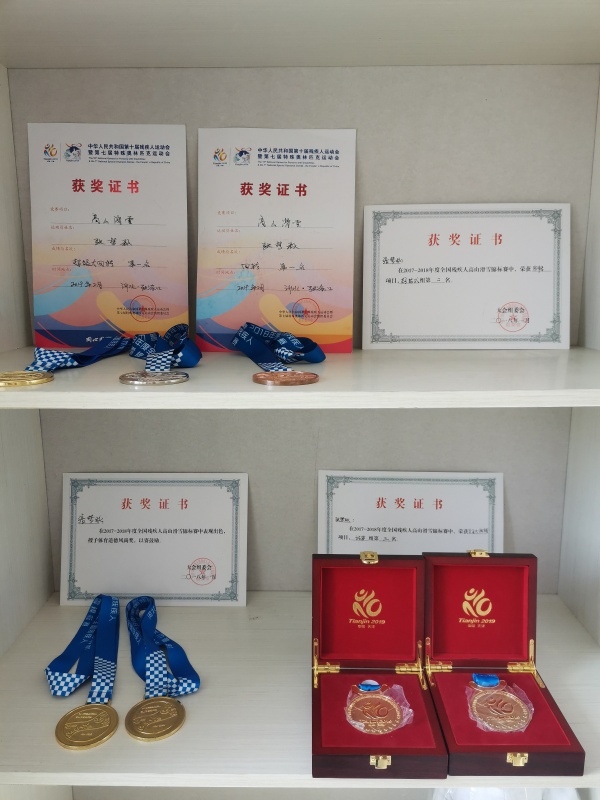 這是張夢秋家中的展柜,里面擺放著她在殘疾人高山滑雪運動中歷次取得的獎牌、獎狀。新華社發(fā)(受訪者供圖)