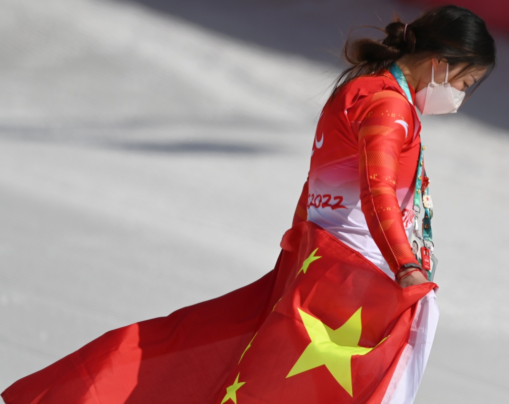 3月6日,張夢秋奪得北京2022年冬殘奧會殘奧高山滑雪女子超級大回轉(zhuǎn)(站姿)比賽冠軍后身披國旗慶祝。新華社記者 李嘉南 攝