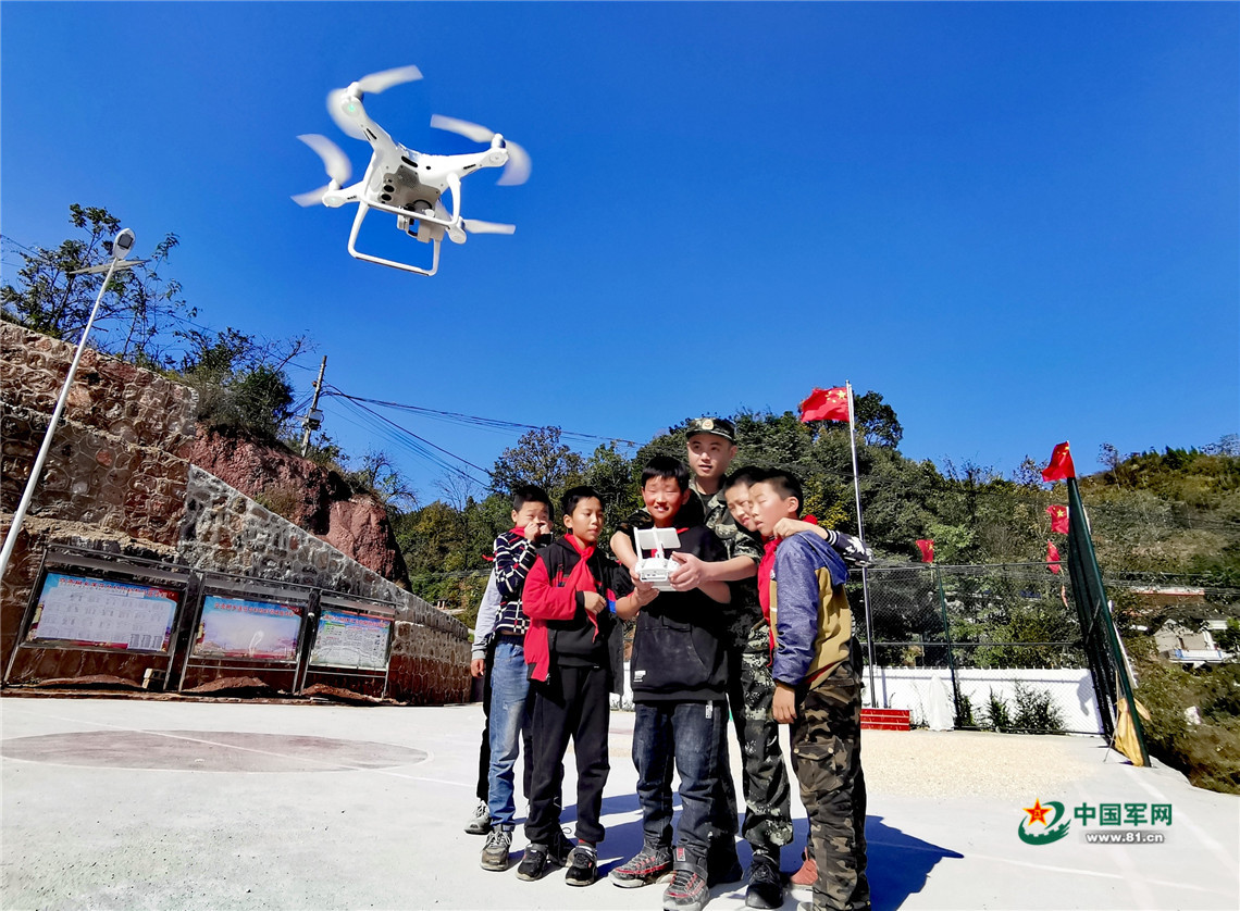 武警官兵在桑植縣空殼樹鄉(xiāng)蓮花臺村為孩子們教授無人機(jī)操作。