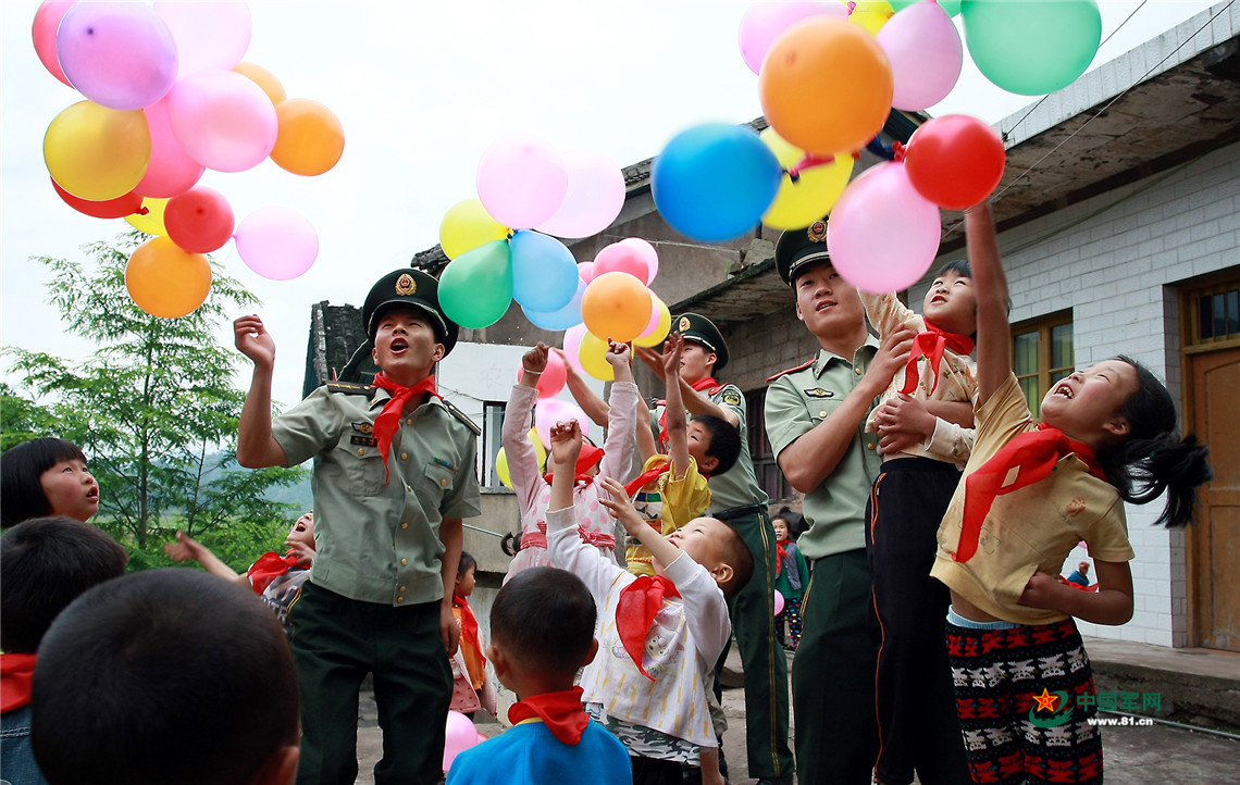 2012年5月,武警官兵在桑植縣汨湖鄉(xiāng)國營農(nóng)墾小學(xué)與同學(xué)們做游戲,樂在其中。