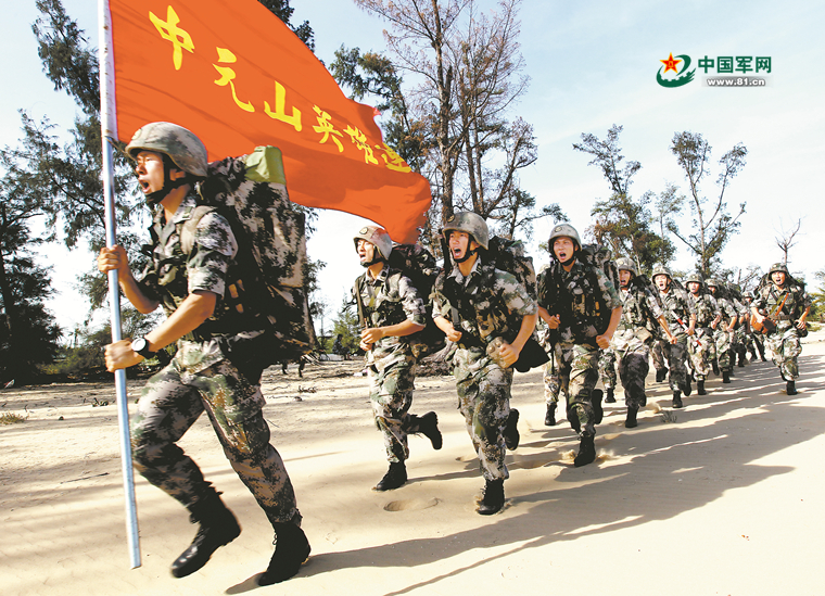 陸軍某海防旅“中元山英雄連”官兵重裝拉練。 李 駿攝