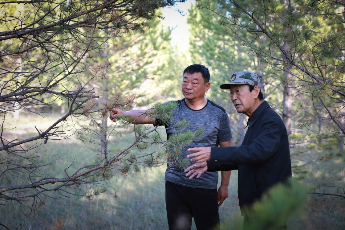 張連?。ㄓ遥┡c兒子張曉斌在山西大同左云縣張家場(chǎng)鄉(xiāng)北梁山坡巡查樹(shù)木生長(zhǎng)情況(9月28日攝)。新華社發(fā)(丁美寧 攝)
