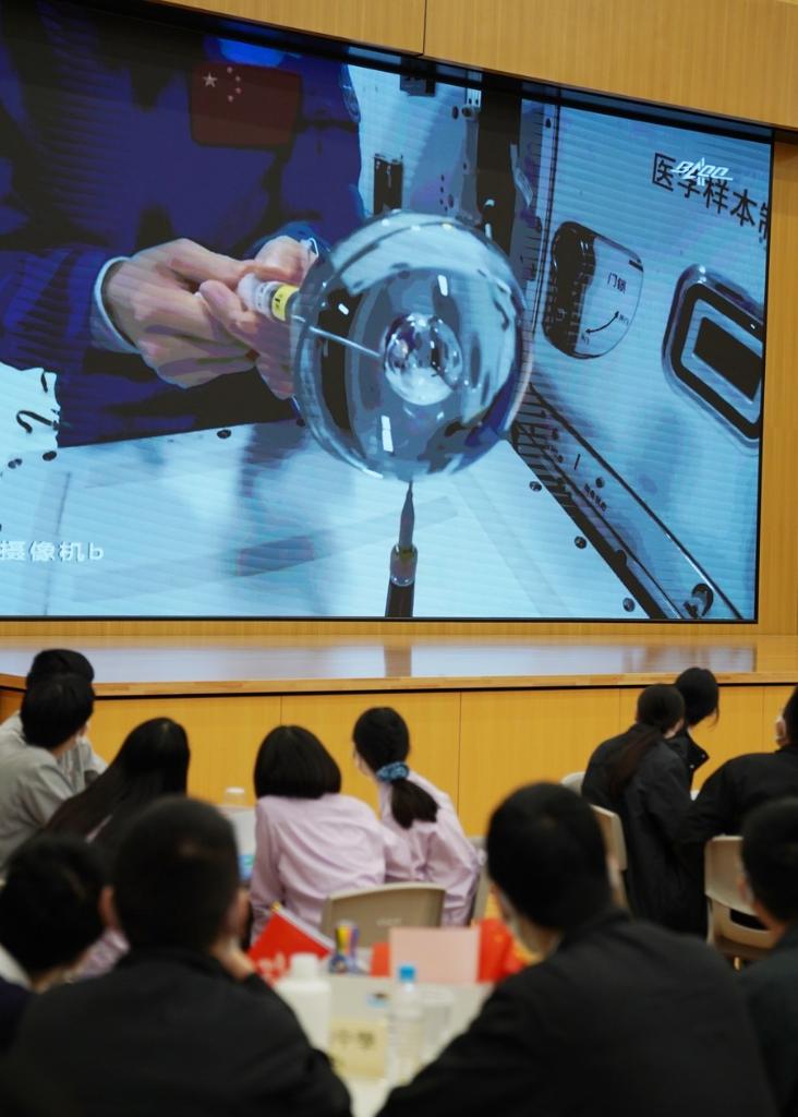 在失重狀態(tài)下,航天員漂浮到空間站內(nèi)不同的區(qū)域,展示他們在太空中的工作和生活場景,并與學(xué)生一同進行多項實驗,包括太空細胞學(xué)研究實驗展示、浮力消失實驗、水膜張力實驗、水球光學(xué)實驗等,講解背后的科學(xué)原理。