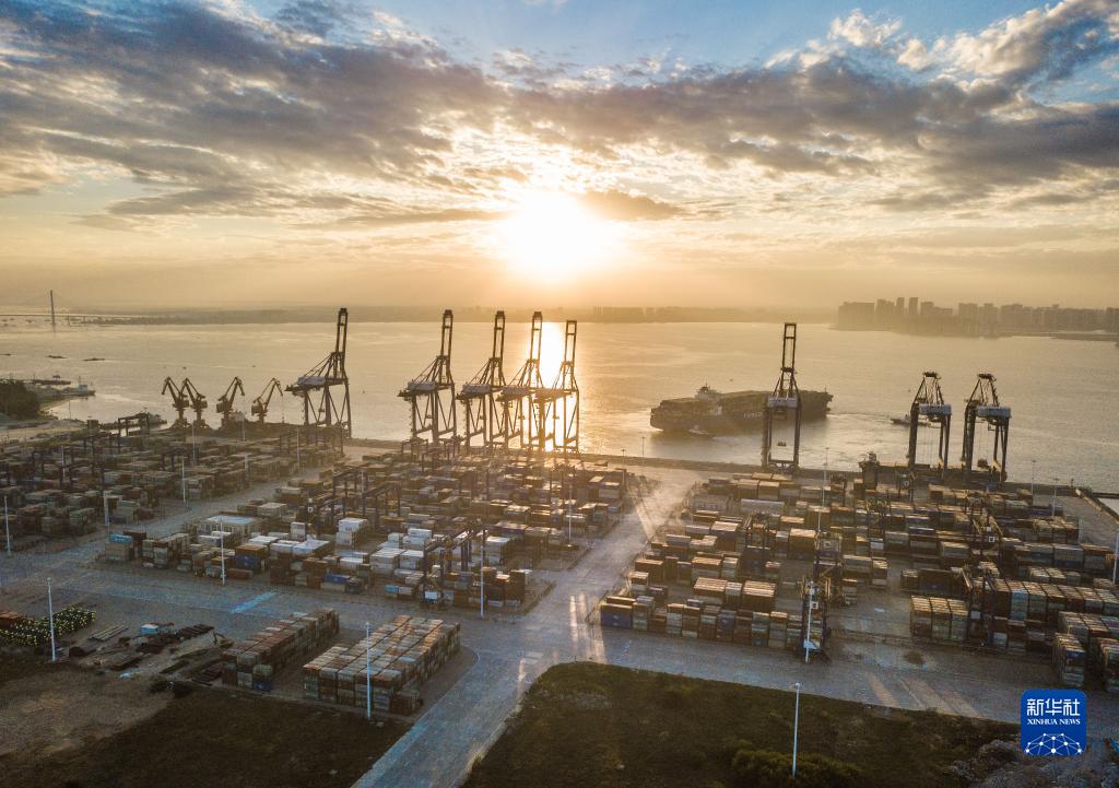 這是2021年12月5日清晨在海南洋浦經(jīng)濟開發(fā)區(qū)拍攝的海南自貿(mào)港建設重要的集裝箱航運樞紐——洋浦國際集裝箱碼頭(無人機照片)。新華社記者 蒲曉旭 攝