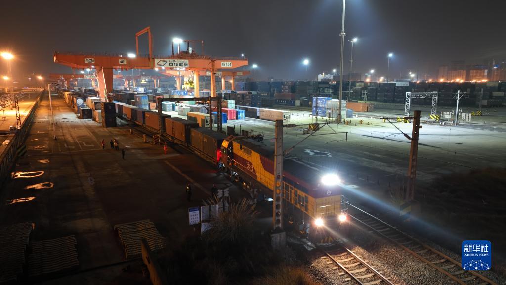 2022年1月28日,中歐班列X8086/5次列車駛出成都鐵路集裝箱中心站,這是中歐班列累計開行的第5萬列列車(無人機照片)。新華社發(fā)(白桂斌 攝)