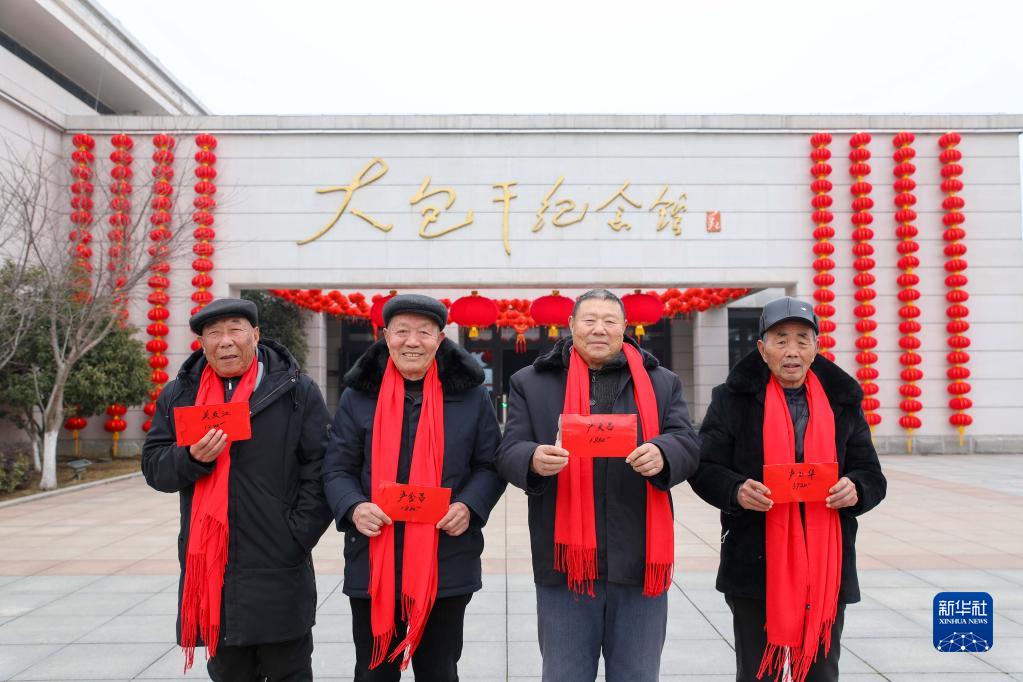 2022年1月26日,在安徽省鳳陽縣小崗村,“大包干”帶頭人展示自家領取的分紅紅包。新華社記者 曹力 攝